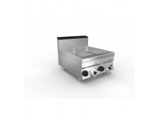 Indicazione del livello minimo e massimo di utilizzo olio stampata sulla vasca.b Le vasche delle versioni elettriche e gas con elementi riscaldanti esterni hanno vasche stampate a “V” per agevolare le fasi di pulizia.n Forniti di serie griglia di fondo, cestello friggitrice e coperchio vasca. Accensione piezoelettrica dotata di protezione anti infiltrazioni.